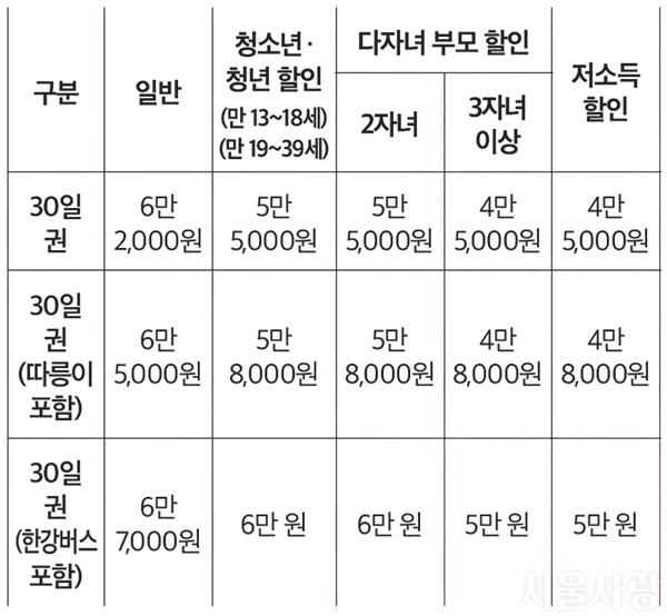 정기권 30일 2시간권 7,000원, 1년 2시간권 4만 원