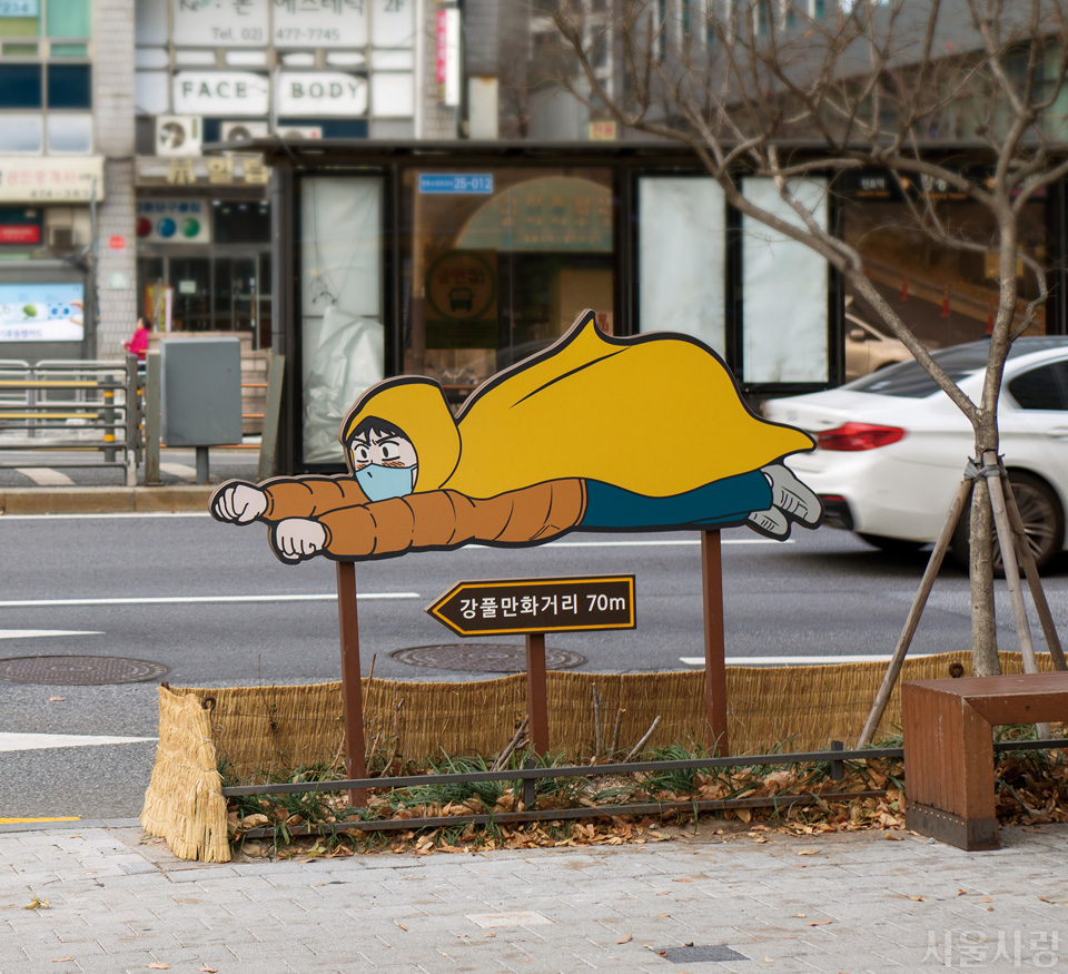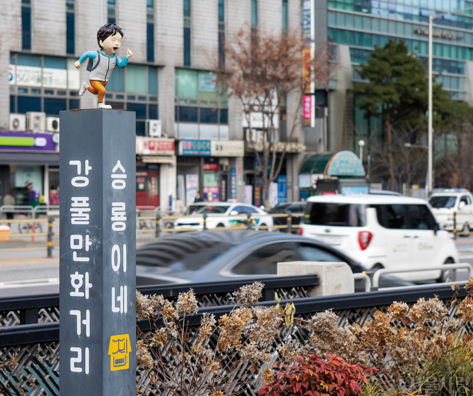 강풀만화거리는 웹툰 작가 강풀이 오래 살아온 동네, 강동구 성내동을 배경으로 한 작품들을 실제 골목에 옮겨 놓은 ‘생활 웹툰 거리’다. 골목 담장과 계단, 전봇대 곳곳에는 강풀의 대표작 <순정만화>, <바보>, <그대를 사랑합니다>, <당신의 모든 순간> 속 명장면과 대사가 주민의 일상 풍경과 어우러져 있다.